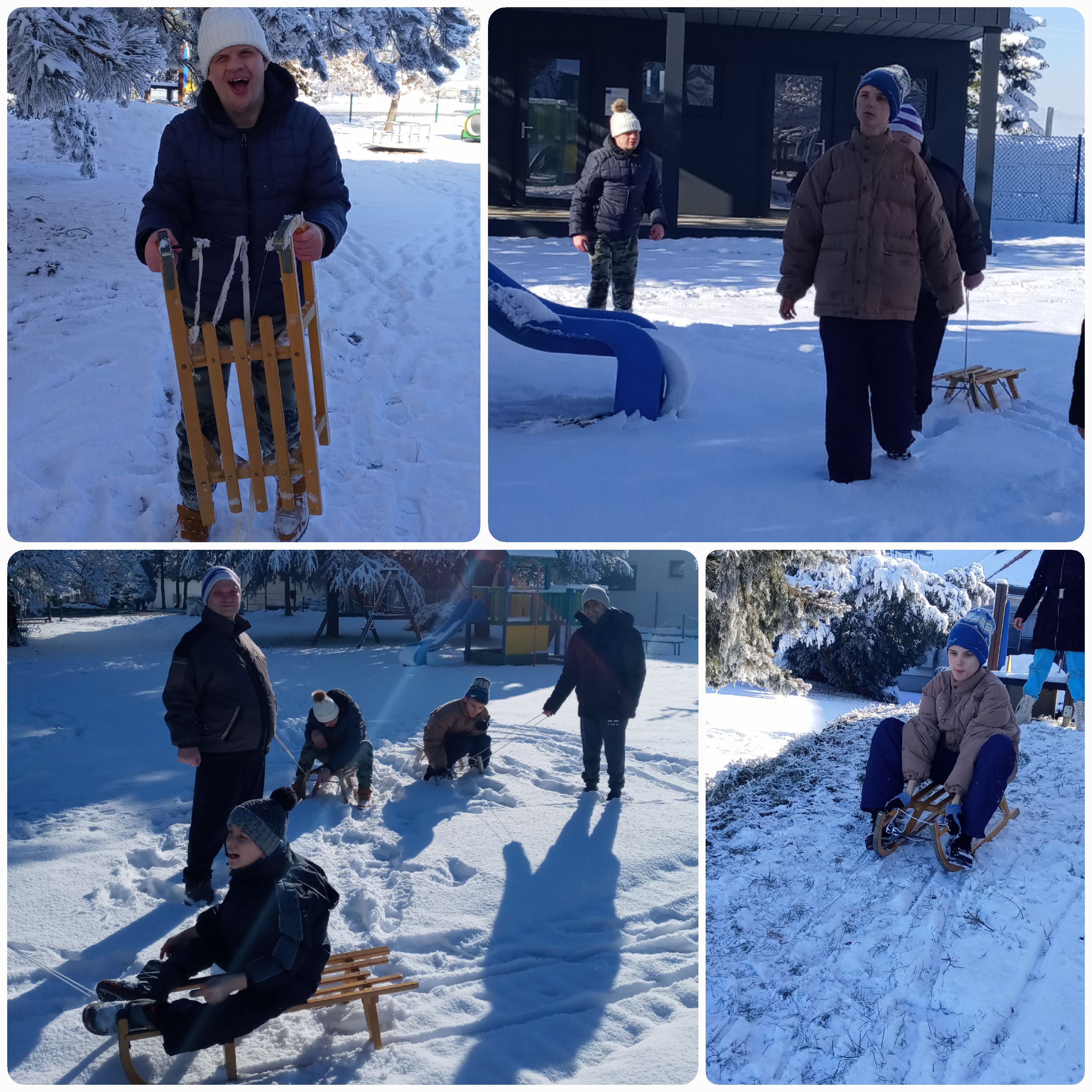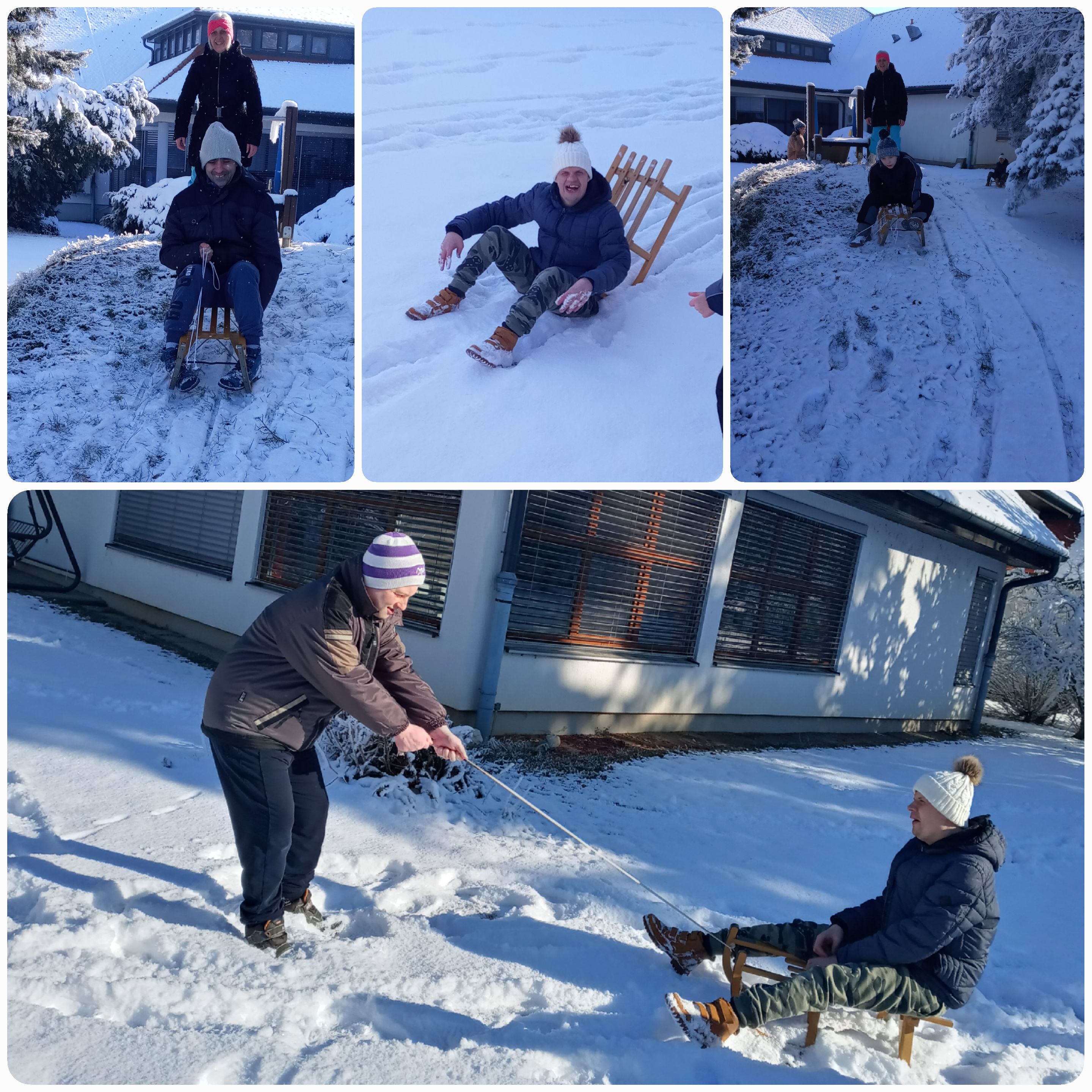 Juhuhu, sneg je tu... Ker smo se snega zelo razveselili, smo z navdušenjem hitro poiskali sanke, oblekli topla oblačila in odhiteli na sankanje ob zavodu v Dornavi. Imeli smo se čudovito, to je bila najboljša zabava. Kasneje smo se vsi premraženi vrnili v topel dom.