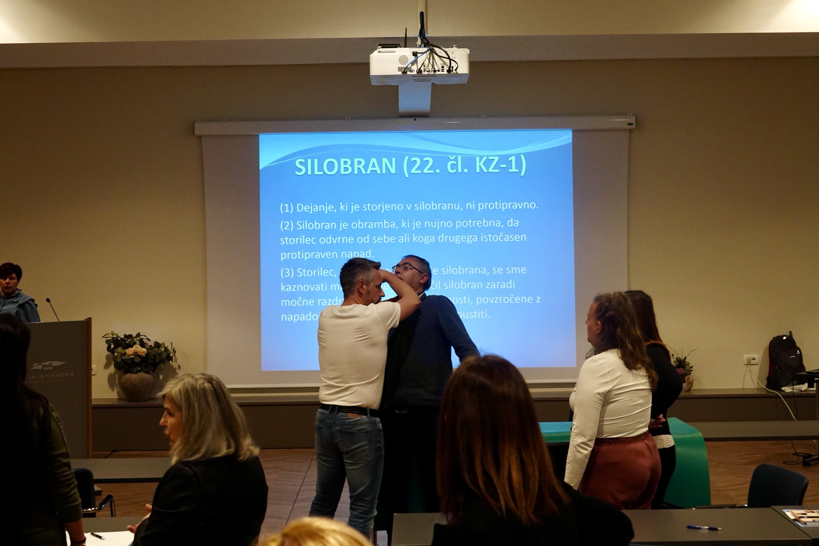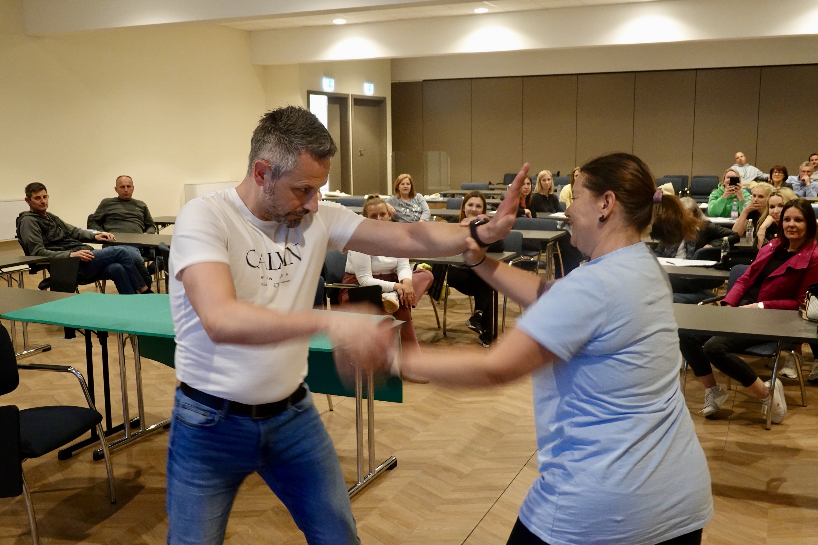 Poznavanje teorije je eno, drugačna zgodba se pojavi ob izbruhu kriznega dogodka. Temu je bilo namenjeno praktično usposabljanje, kjer je Rajko Nemec, tudi inštruktor borilnih veščin in samoobrambe, s prikazom vadbe obramb pred najpogostejšimi napadi, varnim odzivanjem in umikom iz nevarnih situacij, prikazal možne oblike obramb pred najpogostejšimi napadi.